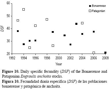 Las variaciones en la FDE de una población están determinadas fundamentalmente por la frecuencia de puesta y por la fecundidad relativa. En el caso de la población bonaerense se observó una aparente disminución de FDE hacia el final del periodo analizado. La variación de la FDE de stocks de anchoas puede variar de manera importante entre años, áreas o estaciones, en respuesta a cambios ambientales o al régimen trófico (Somarakis et al. 2004); además, ésta suele resultar independiente de la biomasa y estar relacionada también con factores tales como el momento en que se desarrolla la campaña o las condiciones térmicas del agua de mar durante la misma (Motos 1994). Los valores de FDE aqui presentados fueron similares a los estimados para E. encrasicolus (Somarakis et al. 2004), E. mordax (Lo 1997) y E. ringens (Hunter y Lo 1997).