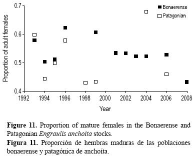 Dentro del máximo de puesta de E. anchoita, las proporciones de hembras maduras (R) variaron entre 43% y 68%, con una media de 53%. Se han estimado cifras similares para la anchoa europea Engraulis encrasicolus (Somarakis et al. 2004) y para la anchoveta de Chile E. ringens (Cubillos et al. 2007). Durante la época reproductiva la proporción de hembras en los lances de pesca suele ser mayor que la de machos. Esto se debe a que la relación inversa en general se observa solamente en los cardúmenes reproductivos (próximos al momento de la puesta), los cuales son menores, menos densos, y por lo tanto menos atractivos para su captura comercial (Hunter y Golberg 1980). Por el contrario, Uriarte et al. (1996) han señalado que la baja proporción de hembras de anchoa europea capturadas durante el máximo reproductivo de primavera puede ser atribuida a que las hembras próximas al desove se ubican en áreas y/o profundidades no muestreadas por la flota comercial. En nuestro caso, el material provino exclusivamente de campañas de investigación donde los lances se realizaron al identificar cardúmenes o señales acústicas de interés, independientemente de la hora del dia, que permitian la captura de un número representativo de peces. Por lo tanto es posible que se haya subestimado la fracción de machos que conforman esos pequeños cardúmenes reproductivos, separados del resto.