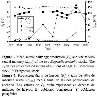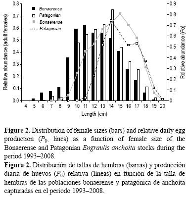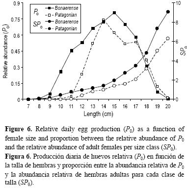 El análisis de la producción de huevos por tamaño de las hembras ilustra claramente que las clases de talla mayores fueron las que más contribuyeron al potencial reproductivo de ambos stocks de anchoita. Estas clases, a pesar de tener un menor número de individuos con respecto a las de tallas menores, produjeron en proporción mayor cantidad de huevos, combinando además otros atributos que contribuyen a incrementar P0 como su elevada fecundidad y mayor proporción de hembras maduras en relación con las clases más pequeñas (Marshall et al. 1998). A su vez, peces más grandes pueden producir ovocitos en un periodo de tiempo mayor, incrementando no sólo el número de huevos desovados, sino también la probabilidad de supervivencia de los mismos (Lambert 1990, Kjesbu et al. 1996). En el caso de la anchoita argentina, la población bonaerense presentó una moda en la distribución de tallas de 11 cm LT, aunque la máxima producción de huevos se observó en la clase de talla de 15 cm LT. De igual manera, si bien la mayor abundancia de la población patagónica fue del rango de 1014 cm LT, la mayor P0 fue producida por las clases de talla entre 14 y 17 cm LT.