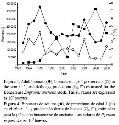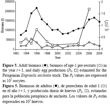 Por otra parte se analizó la relación entre la producción de huevos y (1) la biomasa de adultos (BA) y (2) la biomasa de los reclutas de edad 1 (BR1) al año siguiente. No se observó ninguna correlación entre P0 y las citadas variables ni en la población bonaerense (fig. 4; BA vs P0: P > 0.360; P0 vs BR 1: P > 0.064), ni en la población patagónica (BA vs P0: P > 0.310; P0 vs BR1: P > 0.960). Sin embargo, como puede observarse en la figura 5, los dos máximos de abundancia de adultos del stock patagónico (1996 y 20062007) coincidieron con los dos valores máximos de producción de huevos, algo que no se detectó en la población bonaerense.