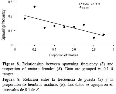La fracción de hembras desovantes osciló entre 8% y 19%, lo cual representó un desove cada 513 dias. Se han descrito valores similares de S en E. mordax (Bindman 1986), E. ringens (Alheit et al. 1984) y E. capensis (Shelton et al. 1993). Sin embargo, E. japonica y E. encrasicolus presentaron valores sensiblemente más altos, con fracciones de desovantes entre 30% y 70% (Tsuruta y Hirose 1989, Motos y Santiago 1990).