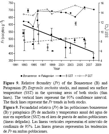 La fecundidad parcial relativa de E. anchoita varió entre 370 y 700 ovocitos g1 de hembra. Si bien Fr fue mayor en el stock bonaerense, también fue mayor su dispersión. Las estimaciones de Fr de E. anchoita fueron similares a las de otras especies como E. japonica (Tsuruta y Hirose 1989), E. mordax (Hunter et al. 1985), E. encrasicolus (Motos y Santiago 1990) y E. capensis (Shelton et al. 1993). En la anchoita argentina, al igual que lo observado en otras especies de peces marinos (Lambert et al. 2005), Fr incrementa con la talla (Pájaro et al. 1997). Esto significaria que una disminución de L50% daria como resultado una disminución de la media poblacional de Fr, al haber individuos maduros más pequeños capaces de reproducirse. Sin embargo, la disminución de Fr en el periodo 19932008 no parece haber tenido relación con ningún cambio en la estructura de la población desovante ni en la talla de primera maduración sexual.