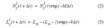 Para la dinámica de las cohortes, se consideró el incremento en la longitud por efecto del crecimiento y la disminución del número de individuos por efecto de la mortalidad natural y de la pesca. Cada cohorte fue separada en clases de longitud de 0.5 cm utilizando la ecuación 1, y la mortalidad natural y el crecimiento se aplicaron a los individuos de cada intervalo de clase por la mitad del paso de tiempo de un mes (Δt = 15 días). El efecto de la mortalidad natural fue modelado por decaimiento exponencial (ecuación 2) y el crecimiento mediante el modelo de von Bertalanffy parametrizado según la ecuación de Brody (Schnute y Richards 2002) (ecuación 3) sobre cada una de las clases de longitud en las cuales se supuso que los individuos crecen y mueren de manera homogénea, escribiendo así: