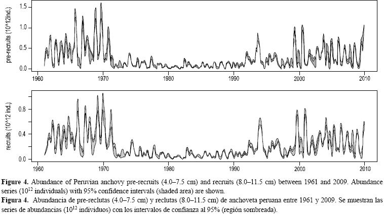 En los patrones estacionales del primer régimen (19611971) se observó un ingreso constante de reclutas desde octubre, con un promedio sostenido en 0.4 × 1012 individuos, que alcanzó su punto máximo entre los meses de marzo y abril. Estos resultados son similares a los descritos por Jordán (1976), quien manifestó que el "patrón general de reclutamiento" se observa a partir de noviembre a diciembre y alcanza sus valores más altos de febrero a marzo como consecuencia de los desoves de inviernoprimavera y un reclutamiento secundario en invierno proveniente de los desoves de verano. La regularidad del patrón estacional en la década de los 60 se puede atribuir a la marcada relación entre la densidad de la población adulta y el reclutamiento subsiguiente documentada por Csirke (1979). Esta regularidad se vio alterada durante 19721973 debido a la drástica disminución de la población de anchoveta debido al incremento de la presión pesquera que condujo al colapso del reclutamiento a comienzos de 1971, y que fue intensificada por la presencia de El Niño 19721973 (Pauly y Palomares, 1989). Durante el segundo régimen (19711991) la anchoveta peruana se vio fuertemente afectada por continuos eventos cálidos de El Niño durante los años 1976, 19821983 y 19871988 (Lagos 1984, Zuta et al. 1984, Macharé y Ortlieb 1993, Morón 2000, Trasmonte y Silva 2008) que, junto a los bajos niveles de abundancia del stock adulto no posibilitaron el éxito reproductivo y, por ende, el éxito del reclutamiento (Jordán 1976), observándose un patrón estacional sin máximos bien definidos y con reclutamientos medios similares durante la mayor parte del año en los resultados.