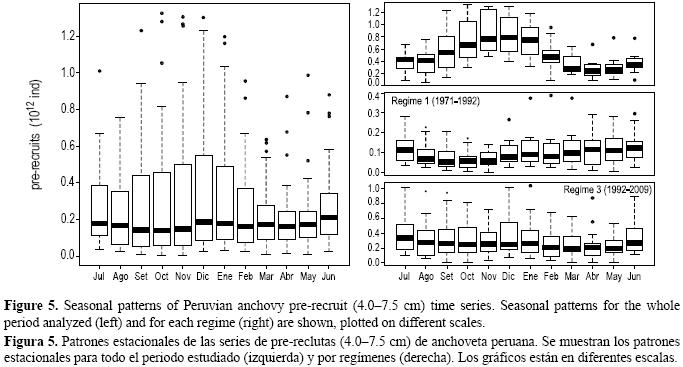 Las series de tiempo de prereclutas y reclutas se muestran en la figura 4, donde se pueden identificar los tres periodos cualitativamente distintos, con abundancias altas, bajas e intermedias, respectivamente. Las figuras 5 y 6 muestran diagramas de cajas de los patrones estacionales por mes de las series de prereclutas y reclutas, respectivamente, para todo el periodo estudiado y para cada uno de los regímenes detectados, en los que se nota que en la década de los 60 las diferencias estacionales fueron más marcadas que en décadas posteriores. Además de los cambios en la abundancia entre los diferentes regímenes, también se observan cambios en la estacionalidad de los patrones de reclutamiento y prereclutamiento.