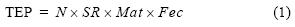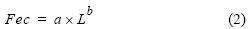 donde N es el número de individuos, SR es la razón de sexos (proporción de hembras a la edad), Mat es la proporción de individuos maduros y Fec es la fecundidad potencial. En general, la fecundidad potencial se relaciona con la longitud (L) mediante la siguiente ecuación: