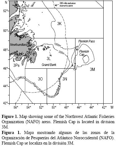 Los datos utilizados aquí provienen de dos campañas de investigación en Flemish Cap (fig. 1). El primero se realizó durante el invierno por el Departamento de Pesca y Océanos de Canadá y abarca los años de 1978 a 1985. El segundo inició en junio/julio de 1988 y continúa a la fecha como parte de un programa de muestreo de la Unión Europea, con la participación de España y Portugal. Por tanto, la serie de tiempo empleada en este estudio abarca el periodo de 1978 a 2008.