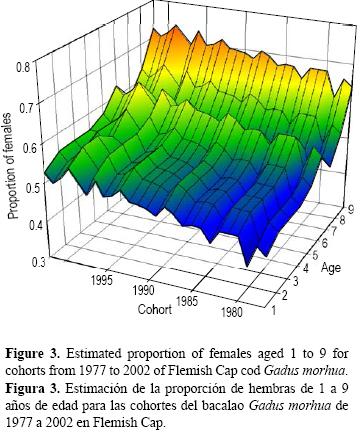 Asimismo, la razón de sexos varió a lo largo de la serie de tiempo. En las cohortes anteriores, la proporción de machos era mayor que la de hembras a las primeras edades, patrón que se ha invertido en las cohortes más recientes. También se han observado cambios en la razón de sexos en otras poblaciones de bacalao (Jakobsen y Ajiad 1999, Morgan y Brattey 2005). Según Jakobsen y Ajiad (1999), el mayor reclutamiento de machos podría resultar en la predominancia de éstos en la razón de sexos de jóvenes. Mediante una simulación, estos autores encontraron que el mejor ajuste a los datos observados se obtuvo bajo la suposición de una mayor mortalidad de machos que de hembras durante el desove. Esta observación combinada con el hecho de que los machos maduran aproximadamente un año antes que las hembras podría explicar el incremento en la proporción de hembras con la edad; sin embargo, en el caso del bacalao de Flemish Cap, se ha observado una mayor proporción de hembras no sólo en edades más avanzadas sino también en edades más tempranas desde principios de la década de los noventa. Aún se desconoce la razón de esto.
