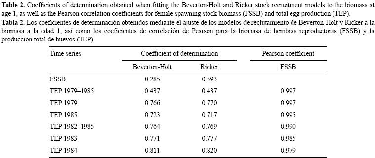 La FSSB y las seis series temporales de TEP se ajustaron individualmente a los datos de reclutamiento usando los modelos de BevertonHolt y Ricker. La proporción de varianza explicada aumentó al incluir TEP en el modelo en vez de FSSB, excepto en el caso del modelo de Ricker con un valor de b de 3.19 (tabla 2). El coeficiente de determinación mostró que la predicción de reclutamiento mejoró notablemente cuando la relación fecundidadlongitud se apartó más de la relación pesolongitud, i.e., en 1984 cuando los coeficientes alométricos fueron 4.42 y 3.29, respectivamente.