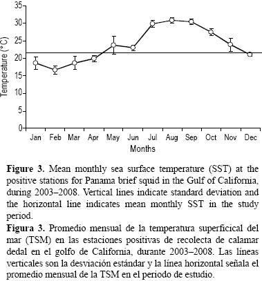 La presencia de L. panamensis en el golfo de California confirma lo registrado por Fisher et al. (1995) respecto a su área de distribución; sin embargo, el intervalo de temperatura (2127 °C) que ellos registran para esta especie difiere de lo encontrado en el presente estudio (1732 °C). La relación entre la TSM y la abundancia de L. panamensis coincide con lo documentado para otros loliginidos (Pierce et al. 1994). Durante el periodo de estudio (20032006 y 2008), el intervalo de temperatura fue amplio (1732 °C); sin embargo, la mayor abundancia se registró durante los meses con menor TSM (diciembre, enero, febrero, marzo, abril), cuando osciló entre 17 y 22 °C. Las mayores abundancias en este periodo se localizaron en la zona más productiva del golfo (parte alta del golfo), donde el enriquecimiento es originado por los procesos de mezcla por marea (LluchCota y AriasAréchiga 2000). La presencia del calamar dedal en esta zona posiblemente está asociada a una mayor fuente de alimento, razón por la cual sus mayores abundancias se hayan localizado en esta zona en los meses fríos.