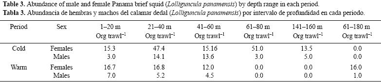Al analizar los datos de abundancia y distribución de L. panamensis respecto a la profundidad, se observó un patrón similar en ambos periodos tanto en hembras como en machos (tabla 3). La mayor abundancia se registró entre 7 y 40 m de profundidad y la menor abundancia entre 60 y 180 m de profundidad.