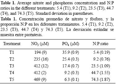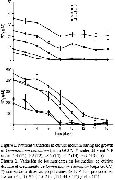 En el día 0 un cultivo en fase exponencial de crecimiento se utilizó como inóculo en cultivos de lote con proporciones de N:P de 5.4, 9.2, 23.5, 44.7 y 74.3 (por triplicado). Las cinco proporciones de N:P se iniciaron adicionando un inóculo de 50 mL de G catenatum (2.068 × 105 células) a 350 mL de agua de mar enriquecida con medio f/2 modificado a matraces de Pyrex de 500 mL. Las concentraciones finales de NO3 y PO4 y las proporciones N:P se muestran en la tabla 1. Las condiciones de cultivo fueron las descritas anteriormente (ver aislamiento y cultivo de G. catenatum). Cada segundo día hasta el día 16 de crecimiento, entre 09:00 y 10:00, se tomaron muestras de 45 mL para realizar los conteos celulares, la determinación de peridinina y nutrientes (nitrato y fosfatos), y el análisis de toxinas. Los cultivos se agitaron suavemente antes de tomar las muestras. Para el análisis de peridinina y toxinas, se tomaron 20 mL del cultivo y se concentraron por filtración a través de filtros GF/F y se congelaron inmediatamente a 40 °C hasta su análisis. Para el análisis de nutrientes se filtró el medio de cultivo (40 mL) (ver detalles más adelante). El resto del cultivo (5 mL) se preservó con una solución de Lugol para conteos celulares. La densidad celular se estimó mediante una cámara para microscopio invertido de 5 mL (Zeiss, Alemania). Los conteos celulares se realizaron por duplicado (ver tasas de crecimiento). El resto de los datos de este estudio fueron el promedio de tres cultivos independientes bajo la misma proporción de N:P. Los diferentes tratamientos N:P (tabla 1) se nominaron como T1, T2, T3, T4 y T5 para las proporciones de N:P de 5.4, 9.2, 23.5, 44.7 y 74.3, respectivamente.