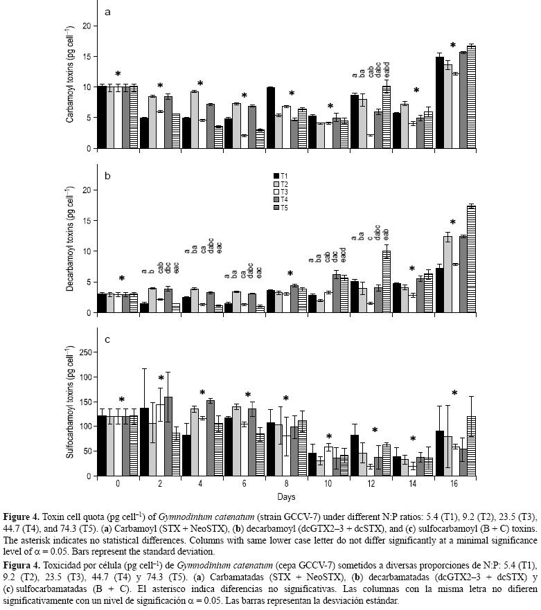 En síntesis, nuestro estudio muestra que, aunque la cepa no fue adaptada a los diversos tratamientos, excepto T3, nuestros resultados concuerdan con lo demostrado para otras cepas de ésta especie (Oshima et al. 1993, Flynn et al. 1996), donde se observó que la toxicidad y el perfil de las toxinas sufren pocos cambios. En este trabajo el grupo de las toxinas sulfocarbamatadas fue el más abundante seguido de las carbamatadas (principalmente NeoSTX), y coincide con trabajos previos en los que usaron cepas aisladas del golfo de California (BandSchmidt et al. 2005, 2006). Claramente, G. catenatum puede crecer en un intervalo amplio de proporciones de N:P y mantener un crecimiento moderado y toxicidad similar. También es claro que las tasas altas de N:P pueden estimular la producción de una mayor biomasa celular, lo que coincide con datos del estado nutricional (eutróficos) de los lugares donde prolifera, y sugieren que estas condiciones favorecen su crecimiento. Las diferencias observadas en el perfil de toxinas con la fase de crecimiento parecen deberse a la interconversión o a la excreción selectiva de las toxinas menos potentes. Finalmente, es importante señalar que existen diferencias importantes en muchos parámetros fisiológicos y bioquímicos entre cepas de la misma especie aún siendo aisladas de la misma área (Wood y Leathan 1992, Burkholder y Gilbert 2006, Kodama 2010). Más aún, se han observado cambios importantes en la toxicidad a nivel de subcepas de Alexandrium tamarense (Ogata et al. 1987). Por lo tanto, nuestros resultados deben verse sólo como una contribución al conocimiento de la respuesta de la cepa "mexicana" de G. catenatum a los nutrientes. También el mantenimiento de esta cepa en condiciones de laboratorio por varios años tiene que tomarse en consideración para la inferencia de nuestros resultados a condiciones naturales. Con respecto a la presencia de neosaxitoxina, ésta también debe considerarse de manera tentativa ya que el método usado (Yu et al. 1998) no es tan eficiente en la separación de NeoSTX de la dcNEO (datos no mostrados). Recientemente, se encontró que una cepa del golfo de California no presentó neosaxitoxina (BustillosGuzmán etal. 2011).