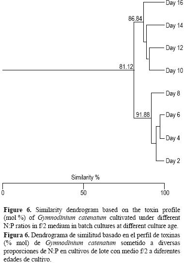 Se observaron cambios importantes (tanto en peso como en moles) en todos los tratamientos con la edad de cultivo (fig. 4, 5). El dendrograma de similitud, considerando este parámetro, también agrupó a todos los cultivos hasta el día 8 y a aquellos de entre el día 10 y 16 (fig. 6). Así, el perfil de toxinas fue similar durante los primeros días de cultivo, pero luego se observó un incremento en las toxinas de los grupos carbamatado y decarbamatado, y una disminución del grupo sulfocarbamatado, en particular la C1 y C2. Esta dinámica sugiere que existe una eliminación selectiva de las toxinas más complejas y/o una transformación de las toxinas más complejas (menos potentes) hacia las menos complejas pero de mayor potencia (toxinas carbamatadas y decarbamatadas). Esto concuerda con otros resultados para otras cepas de G. catenatum aisladas del golfo de California y cultivadas en medio GSe (BandSchmidt et al. 2006).