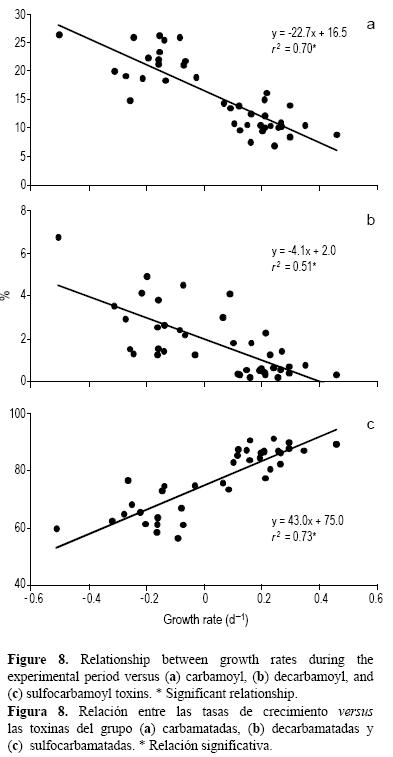 Las tasas de crecimiento y la toxicidad no fueron significativas (fig. 7a), pero sí entre la tasa de crecimiento y el contenido celular de toxinas (fig. 7b). Considerando la composición de toxinas (% mol), se observó una relación negativa entre las tasas de crecimiento y el grupo carbamatado y el decarbamatado (fig. 8a, b), y una relación positiva con el grupo de las sulfocarbamatadas (fig. 8c).