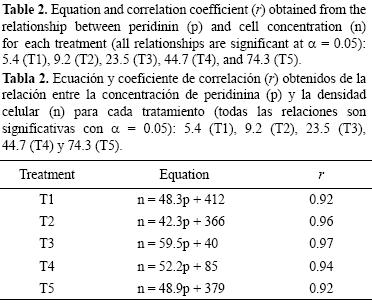 Los conteos para cada tratamiento se relacionaron con los datos de peridinina, determinados por HPLC de acuerdo con Vidussi et al. (1996), para obtener la ecuación de regresión. Todos los coeficientes de regresión (r) fueron mayores que 0.90 (tabla 2). La ecuación resultante (tabla 2) se utilizó para calcular la densidad celular en todos los tratamientos utilizando el contenido de peridinina. Con estos datos, se determinaron las tasas de crecimiento para cada curva de crecimiento para el periodo en que se alcanzó la máxima densidad celular (fase de crecimiento exponencial) y para cada segundo día (tasa de crecimiento diario) de acuerdo con la siguiente ecuación (Guillard 1973):