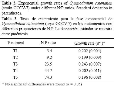 Las tasas de crecimiento exponencial variaron entre 0.20 y 0.24 d1 (tabla 3). Los análisis estadísticos mostraron que no hubieron diferencias en las tasas de crecimiento entre los tratamientos. Sin embargo, al considerar el número máximo de células para cada tratamiento, T3 (5852 cél mL1) tuvo una densidad casi dos veces mayor que T1 y T2 (2553 cél mL1).