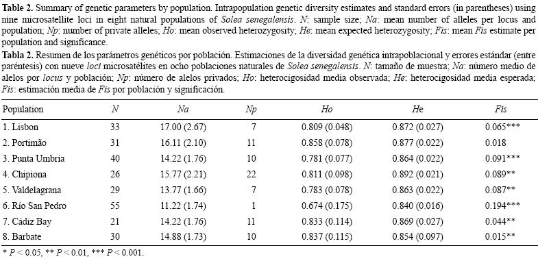 Se obervó una alta variabilidad genética, tanto del número de alelos y la heterocigosidad por locus, en los nueve microsatélites analizados después de la caracterización genética de 265 individuos de ocho poblaciones naturales. Se obtuvo un promedio de 14.65 ± 0.62 alelos por locus por población (tablas 2, 3). El número de alelos varió de 9 en Sol 19 a 68 en Sol MJI, la mayoría de los loci mostrando entre 20 y 30 alelos. Se observaron diferencias ligeras y no significativas (P > 0.05) en el número de alelos entre poblaciones; el valor más bajo correspondió a la muestra de Río San Pedro (11.22) y los valores más altos a las poblaciones portuguesas (16.11 y 17.00 para Portimão y Lisboa, respectivamente). Las diferencias entre la heterocigosidad esperada de cada población no fueron significativas y variaron de 0.8 a 0.9 para la mayoría de los loci, con un promedio de 0.860 ± 0.005 por locus por población.