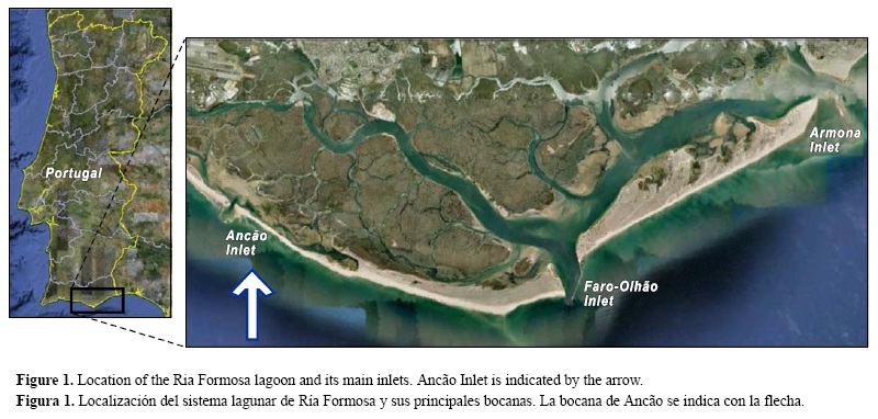 La bocana de Ancão o São Luis, la bocana más occidental de la laguna de Ría Formosa (fig. 2), fue abierta artificialmente en 1997 para mejorar la circulación de agua entre el océano adyacente y la laguna. Es una bocana pequeña, con un ancho promedio de 300 m, y es dominada por el reflujo, mostrando características morfológicas de una bocana dominada tanto por las mareas como las olas con un patrón cíclico de migración hacia el este (Vila-Concejo et al. 2004).