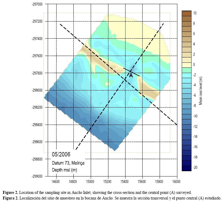 Se realizó un experimento de campo durante un ciclo completo de marea viva en la bocana de Ancão el 27 de abril de 2009. Durante el trabajo de campo se midieron las corrientes en la sección transversal de la bocana (fig. 2); además, se realizaron mediciones físicas y químicas in situ y se tomaron muestras de agua en varias profundidades en un punto central de la sección transversal (localización A, fig. 2). Su localización en el medio de la sección transversal se seleccionó con base en que los resultados de los estudios previos realizados en 2007 no mostraron diferencias horizontales en tres sitios de muestreo en la sección transversal. El número de profundidades de muestreo dependió del nivel del agua, que a su vez dependió de las fases de la marea. Siempre que fue posible las mediciones se hicieron en tres niveles: cerca de la superficie (1 m por debajo de la superficie), a una profundidad intermedia y cerca del fondo (1 m por encima del fondo).