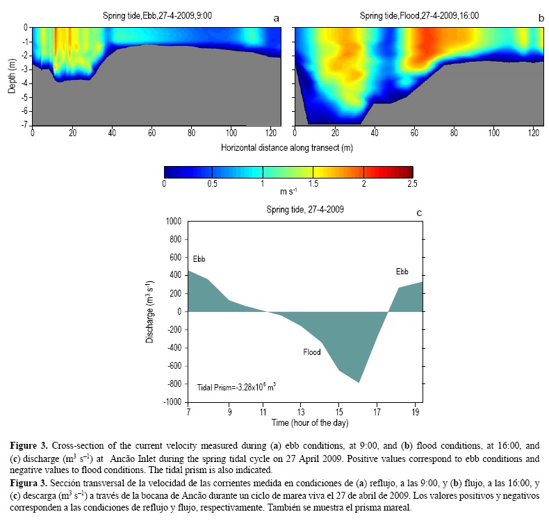 Los valores de descarga, calculados a partir del componente normal de las mediciones de velocidad de la sección transversal realizadas cada hora, se presentan en la figura 3c para todo el periodo de muestreo correspondiendo a un ciclo semidiurno. Los valores positivos corresponden a condiciones de reflujo y los negativos a condiciones de flujo. A partir de los valores de descarga obtenidos y representados en la figura 3c, el prisma mareal residual o transporte neto de agua obtenido es igual a -3.28 x 106 m3. Con base en este resultado, se puede afirmar que hay un influjo o importación de agua del océano a la laguna a través de la bocana de Ancão durante un ciclo completo de marea viva.