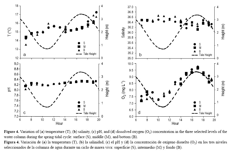 En la figura 4a-d se muestran los parámetros fisico-químicos medidos in situ en los tres niveles seleccionados a lo largo de la columna de agua en el medio de la sección transversal de la bocana de Ancão. La variación vertical por hora de temperatura, salinidad, pH y oxígeno disuelto (concentración y porcentaje de saturación) muestra que las aguas en esta bocana están bien mezcladas y que no hay influencia de agua dulce, por lo que no se observó estratificación en la columna de agua. El intervalo vertical de los parámetros medidos entre la superficie (1 m) y el fondo (máximo 7 m) puede considerarse pequeño y no se encontraron diferencias significativas (P > 0.05) entre los tres niveles seleccionados.