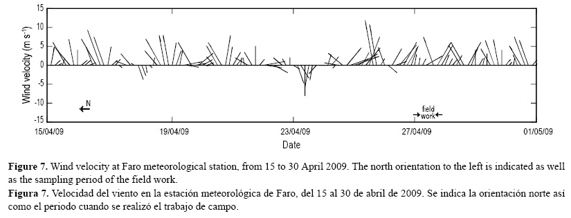 El patrón de incremento/decremento de la concentración de nutrientes durante el reflujo/flujo muestra la fuerte influencia de la marea en la bocana de Ancão asociada con la dilución y mezcla del agua oceánica. Las bajas concentraciones registradas para los tres nutrientes debe estar asociada con la concentración relativamente alta de clorofila a, lo que muestra que el fitoplancton consume los nutrientes, especialmente durante el periodo de mayor estabilidad (relajación del viento, fig. 7) después de las dos semanas de vientos favorables para la presencia de afloramientos en la costa sur de Portugal (fig. 6a-b). Es importante mencionar que los valores de clorofila a, de 4 a 6.2 mg m-3, pueden considerarse altas y típicas de eventos de afloramientos algales que inician en marzo (Wooster et al. 1976). De hecho, los valores registrados en las inmediaciones de las bocanas y en los canales principales de la laguna de Ría Formosa tienden a ser <2 mg m-3 (Moita 2001, Falcão y Vale 2003, Barbosa 2006, Loureiro et al. 2006). Se han registrado valores cercanos a 6 mg m-3 en el cabo de São Vicente y cerca de Faro durante eventos de afloramiento (Moita 2001).