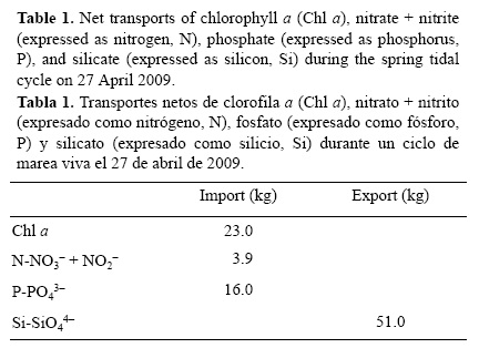 Los transportes netos de nutrientes y clorofila a estimados para el ciclo mareal se resumen en la tabla 1. Esta tabla muestra una importación de nitrato + nitrito (~4 kg), fosfato (16 kg) y clorofila a (23 kg) del océano a la laguna y una exportación de silicato (51 kg) de la laguna al océano por la bocana de Ancão. Debido a la importación de fitoplancton, las concentraciones de nitrógeno y fósforo fueron bajas (casi agotadas). Esto último asociado con una importación neta de agua resultó en un importe de estos nutrientes; sin embargo, representa una fuente de silicato para el océano adyacente según lo indica la exportación estimada.
