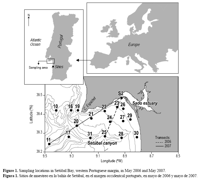 La bahía de Setúbal está localizada entre cabo Espichel y Sines; está dominada por el cañón de Setúbal, un rasgo geofísico y sedimentario complejo que se extiende de la plataforma continental hasta las profundidades del océano (fig. 1). La cabeza del cañón se localiza 20 km al sur-suroeste de la boca del estuario del Sado y 6 km al oeste de la costa más cercana (Lastras et al. 2009). La parte superior del cañón actúa como una trampa natural para la materia orgánica que es transportada a la región por el transporte lateral y el asentamiento vertical de la productividad primaria, pero en el sistema de cañones de Setúbal-Lisboa y su talud adyacente predomina la materia orgánica de origen marino (García et al. 2010).
