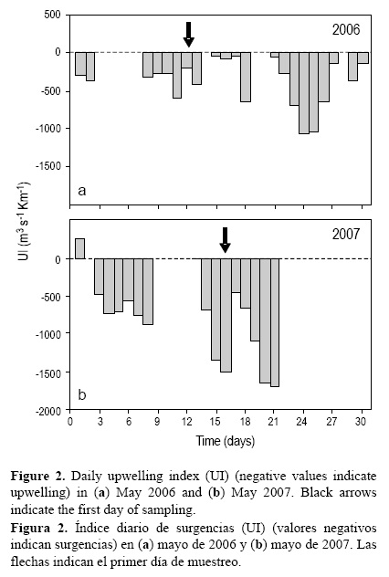Los valores diarios del IS basados en la componente al norte del esfuerzo del viento se calcularon de acuerdo con Bakun (1973). Los datos de viento se obtuvieron de una estación meteorológica permanente del Instituto Nacional de Meteorología (2006, 2007) localizada en cabo Carvoeiro (39°18' N).