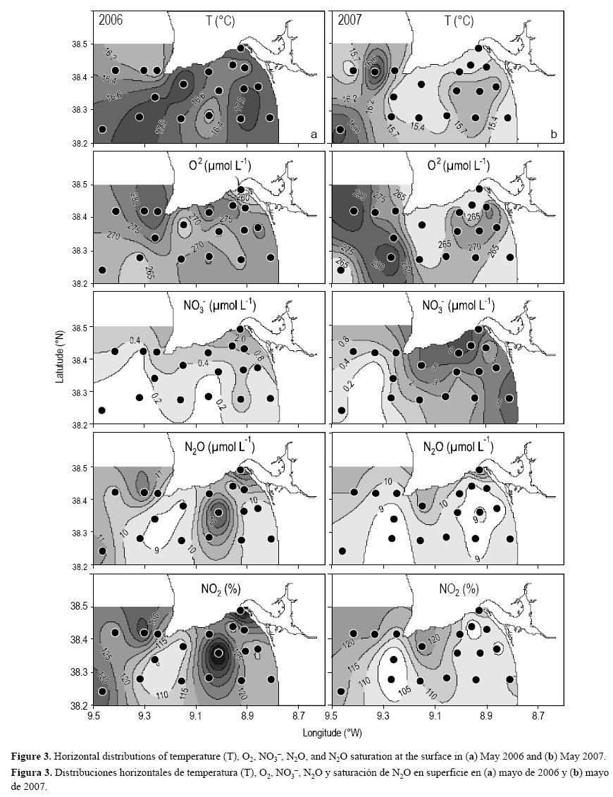 En la figura 3 se muestran las distribuciones de temperatura (T), O2, NO3- y N2O. En mayo de 2006 el patrón de temperatura revela una franja bien defininda de agua más fría (16.0-16.6 °C) que se extiende de la cabeza del cañón de Setúbal hacia la boca del estuario del Sado y también alrededor de cabo Espichel, y que puede ser identificada como agua de surgencias. En mayo de 2007 se detectaron menores temperaturas (15.2-15.7 °C) en una zona más amplia, lo que refleja la mayor intensidad de la surgencia en ese periodo.