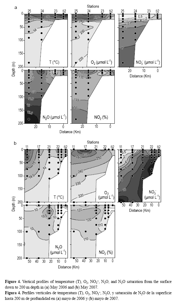 La figura 4 muestra la distribución vertical, de la costa a mar adentro, de T, O2, NO3-, y N2O de la superficie a 200 m de profundidad en dos transectos seleccionados (fig. 1). Se puede notar que en ambos años aguas más fría (13-14 °C), menos oxigenadas (230-240 µmol L-1) y enriquecidas en NO3- (8-12 µmol L-1) surgieron de las profundidades (80/100 m en 2006 y 150/200 m en 2007) a la superficie. Este patrón fue más pronunciado en 2007, con una elevación mucho más abrupta de las isopletas y una columna de agua menos estratificada. De manera similar a lo que ocurre con las surgencias de la corriente de Canarias, en la zona del presente estudio no se desarrolló hipoxia alguna de gran escala, mientras que se sabe que en la mayoría de los sistemas de surgencias costeras existen ZMOs (Zhang et al. 2010).