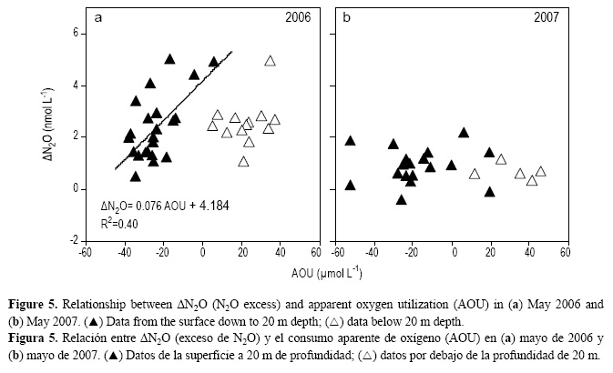 En mayo de 2006 se midieron valores más altos de N2O (12-13 nmol L-1) en las estaciones 24 y 25 (hasta 180 m de profundidad), mientras que en mayo de 2007 la máxima concentración de N2O no pasó de 10-11 nmol L-1 a profundidades menores a 100 m. En general la columna de agua se encontró sobresaturada de N2O, lo que indica que la zona se comporta como una fuente de N2O a la atmósfera. No obstante, los valores de saturación en 2006 fueron mayores que en 2007. Evidentemente, surgencias más intensas incrementan la mezcla y el intercambio gaseoso, lo que conduce a una fuerte dilución de la señal de N2O a tasas que exceden por mucho su reposición por al abasto desde aguas más profundas, tal y como se ha observado en otros sistemas (Cline et al. 1987).