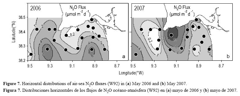 La figura 7 muestra la variabilidad de los flujos de N2O (W92) en todas las estaciones a lo largo de la zona de estudio en ambos años. Las mayores emisiones (4-6 µmol m-2 d-1 en 2006 y 4-15 µmol m-2 d-1 en 2007) coinciden aproximadamente con las mayores saturaciones de N2O de cada año.