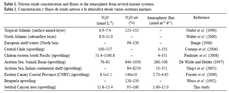 Considerando 144 días (de abril a septiembre) como la media anual de días con condiciones favorables a las surgencias a lo largo de la costa occidental de la Península Ibérica (Alvarez et al. 2012) y un área de incidencia de las surgencias de 22,050 km2, que corresponde a una malla de 0.5° x 0.5° que se extiende a lo largo de las costas portuguesas con aguas más frías (temperatura superficial del mar < 16.5 °C), y suponiendo un flujo medio de N2O de 0.82 ± 1.30 | mol m-2 d-1 (LM86) a 2.30 ± 3.08 |amol m-2 d-1 (W92) en el área de estudio, se estimó una emisión entre 0.04 y 0.102 Gg N año-1 para la zona portuguesa de surgencias. Esto es un orden de magnitud menor que lo estimado para la zona de surgencias frente a Mauritania (16°-21° N, 1.0 Gg N año-1) (Wittke et al. 2010) y mucho menor que los valores reportados para otras regiones de importantes surgencias como el mar Arábigo (46 Gg N año-1) y el Pacífico (119.1 Gg N2O-N año-1) (Nevison et al. 2004), lo que indica que las emisiones de N2O de la costa protuguesa durante las surgencias representan una fuente poco importante de N2O a la atmósfera (0.02-0.05%) comparadas con otras regiones de surgencias costeras.