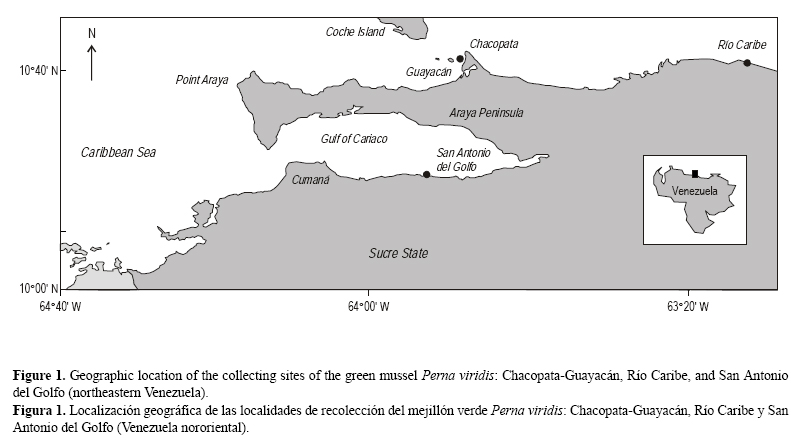 Los ejemplares del mejillón verde P. viridis fueron recolectados en tres localidades costeras del estado Sucre, situadas al noreste de Venezuela (fig. 1): Chacopata-Guayacán (CG, 10°43'25" N, 64°52'6" O), en la región norte de la península de Araya; Río Caribe (RC, 10°42'34" N, 63°06'54" O), al noreste de la península de Paria; y San Antonio del Golfo (SAG, 10°27'5" N, 63°46'23" O), en el sureste del Golfo de Cariaco. Las zonas CG y RC constituyen bancos naturales extensamente explotables de la especie, y SAG es un área de cultivo de mejillones de baja escala.