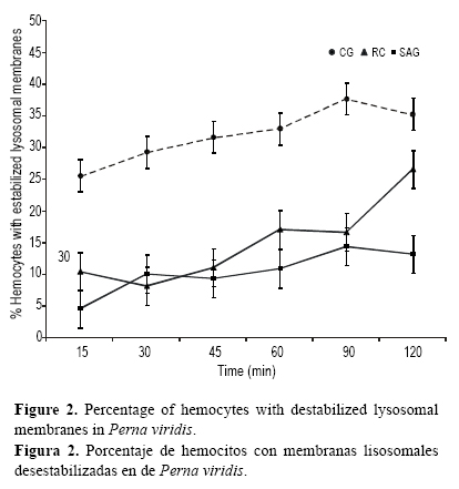 El porcentaje de células con reducida capacidad de retener en sus compartimientos lisosomales el rojo neutro fue significativamente alta en los organismos colectados en CG (Fs = 3.59; P < 0,05); se observaron efectos celulares en los primeros 15 min de ensayo, con el 25.60% de los hemocitos afectados (fig. 2), que continuaron incrementando hasta alcanzar un 37.70% de hemocitos dañados a los 90 min. Los valores promedio máximos (26.60%) para los organismos recolectados en RC fueron alcanzados en los 120 min. La mayor estabilidad lisosomal fue encontrada en los organismos de SAG, con un intervalo de estabilidad de 86.80% a 95.40% durante el trascurso del ensayo.