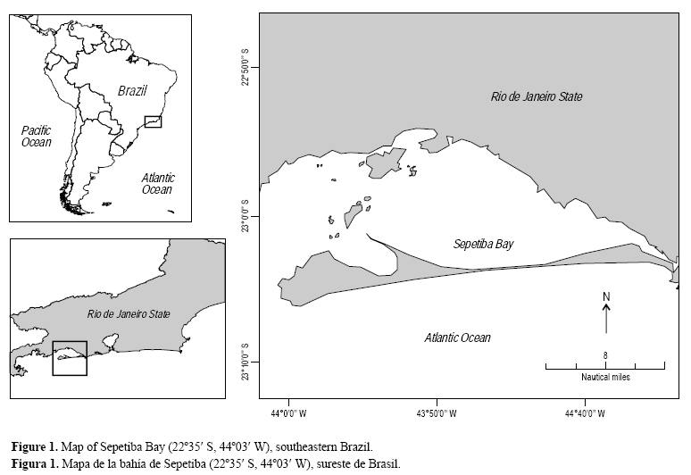 La bahía de Sepetiba (estado de Río de Janeiro, Brasil; 22°35' S, 44°03' W) (fig. 1) es un complejo costero semicerrado con un área de 519 km2 y diversos ecosistemas que incluyen playas, penínsulas, islas, manglares y plataformas intermareales. Mucho de ese complejo es somero (∼6 m de profundidad), pero en algunas áreas aisladas, particularmente entre las islas, la profundidad puede llegar a 47 m (Borges 1990). Esta área tan ecológicamente importante está cercada de más de 400 fábricas asociadas con la industria química, la del metal, la del caucho y la de la imprenta (Marques et al. 2002). Los residuos industriales y de la agricultura que se liberan en la bahía de Sepetiba, junto con la polución resultante del puerto y del cada vez mayor transito de barcos, producen un impacto negativo en esta bahía y conforman una amenaza para la vida silvestre del área (Karez et al. 1994, Magalhaes et al. 2001, Lailson-Brito et al. 2010).