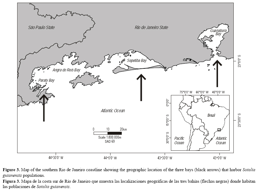 En Brasil hay pocas estimaciones de abundancia de S. guianensis con métodos de captura-recaptura (Pizzorno 1999, Santos y Zerbini 2006) y técnicas de muestreo a distancia (Cremer et al. 2006, Flach et al. 2008a). Estimaciones de abundancia anteriores en la bahía de Sepetiba fueron calculadas por transectos lineales conducidos en 2002 y 2003 (Flach et al. 2008a). La foto-identificación ha sido usada extensivamente para evaluar fidelidad de hábitat, tasas de supervivencia, patrones de asociación y condiciones de salud del delfín Guiana en la bahía de Sepetiba desde 1994 (e.g., Van Bressem et al. 2007, Flach et al. 2008b, Nery et al. 2008a), pero ningún estudio de abundancia que utilice esta técnica había sido realizado hasta ahora.