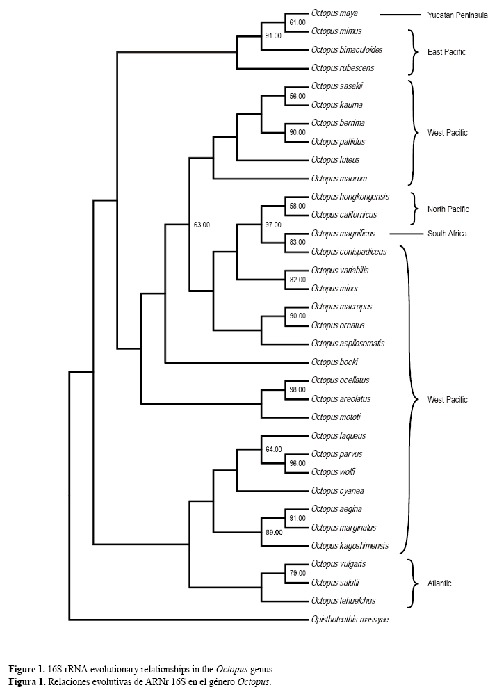 Todos los árboles construidos muestran una amplia congruencia entre las agrupaciones y la distribución geográfica de los taxones, y la relación evolutiva entre O. maya y los pulpos del Pacífico oriental fue consistente durante todo el análisis.