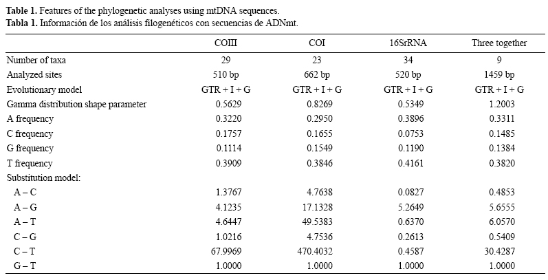 Para todas las secuencias, el modelo GTR+I+G resultó ser el modelo de mutación más adecuado. En la tabla 1 se resumen las características de los análisis filogenéticos realizados. Debido a la disponibilidad respectiva de los datos de secuencia, hubo diferentes números de unidades taxonómicas operativas (UTO) en los árboles construidos para las diversas regiones de un gen.