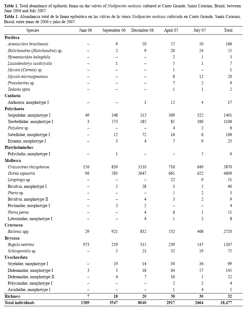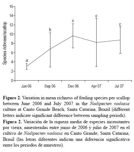 Según estudios previos, la riqueza de especies epibióticas encontradas sobre individuos de N. nodosus en Brasil y Venezuela fue de 20 y 11 especies, respectivamente (Rüpp y Parsons 2006, Uribe et al. 2001). En el presente trabajo, el número incrementó a 31 taxones (tabla 1). En cultivos de Argopecten purpuratus en Chile, se han registrado hasta 63 taxones (Uribe et al. 2001). En nuestro estudio, el número máximo de especies incrustantes sobre una sola vieira fue 13, mientras que el número total de especies registradas durante el periodo de muestreo fue de 32. Después de siete meses, el número de especies tendió a estabilizarse (diciembre de 2006) (fig. 2).