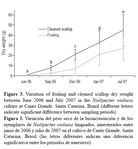 El peso seco de la bioincrustación al final del periodo de cultivo (27 g por vieira) fue menor que el registrado para A. purpuratus de Chile, que varió entre 30 y 170 g por individuo (Uribe et al. 2001). El peso seco de la bioincrustación en relación con el peso seco de la vieira varió de un máximo de 38.5% en abril de 2007 a 36.8% en julio de 2007, el último mes del muestreo. Estos valores también son menores que los encontrados en cultivos de Chlamys nobilis, Lyropecten (Nodipecten) nodosus y Euvola ziczac de 42.65-56.98%, 10-60% (8 m) y 10-37% (8 m), respectivamente (Lodeiros et al. 1998, Lodeiros y Himmelman 2000, Zhenxia et al. 2008). En estos cultivos en China y Venezuela, a pesar de que se limpiaron las conchas se presentaron problemas de crecimiento, la bioincrustación siendo uno pero no el único factor que afectó el crecimiento.