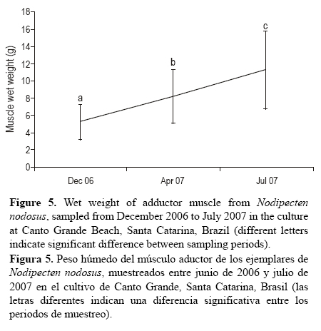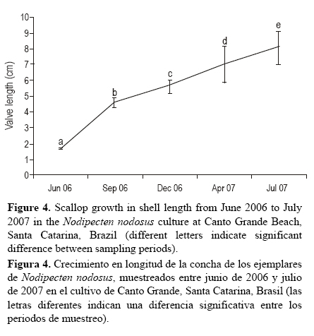 Rupp (2007) también documentó que el aumento progresivo del peso seco promedio de la bioincrustación sobre las valvas de las vieiras que no se limpiaron resultó en un peso promedio bajo del tejido blando y un menor tamaño; esto sugiere que un periodo mayor que 120 días sin limpiar las conchas podría afectar negativamente el crecimiento y/o la supervivencia de las vieiras en Caeira da Barra do Sul. Sin embargo, en el cultivo en Canto Grande, las conchas de N. nodosus no se limpiaron durante aproximadamente 467 días, pero los resultados fueron similares a los obtenidos para las vieiras que se limpiaron en Caeira da Barra do Sul. Una posible explicación para el buen desempeño de N. nodosus, a pesar de la gran cantidad de organismos incrustantes en Canto Grande, es la hipótesis de que se adaptan mejor a la bioincrustación que otros pectínidos. Nodipecten nodosus es una vieira epibentónica y la superficie de la concha queda expuesta al asentamiento de organismos incrustantes en su hábitat natural; por lo tanto, probablemente sea menos vulnerable a los efectos nocivos de la bioincrustación que otros pectínidos en condiciones de cultivo, como E. ziczac (Lodeiros et al. 1998).