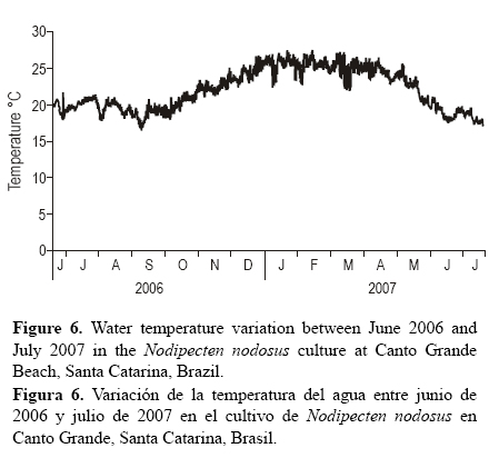 Las vieiras se cultivaron en cestas tipo linterna (lantern nets) de 5 a 8 niveles suspendidas en una alinea madre (longline) a una profundidad de 2 m de la superficie. Las cestas iniciales tuvieron un diámetro de 40 mm (6 mm de luz de malla), pero en el segundo muestreo se transfirieron las vieiras a cestas de 42 mm de diámetro (15 mm de luz de malla). La profundidad en el sitio de cultivo fue de alrededor de 5 m. Las vieiras utilizadas en este estudio se obtuvieron mediante desove inducido en el Laboratorio de Moluscos Marinos, Universidad Federal de Santa Catarina (Laboratório de Moluscos Marinhos, Universidade Federal de Santa Catarina). Se retiraron vieiras juveniles de las bolsas recolectoras en abril y se mantuvieron en un criadero en el mar hasta junio de 2006, cuando inició el muestreo. Se utilizaron 480 vieiras para el estudio. La longitud media inicial de las valvas fue de 15.94 mm. Inicialmente, se sembraron 80 vieiras en cada uno de dos compartimientos de tres cestas. Durante el periodo de cultivo, se redujo la densidad de vieiras y se dividieron entre cinco compartimientos de las cestas, ocupando 30% del área de fondo del compartimiento. La temperatura del agua se registró cada hora desde el 21 de junio de 2006 hasta el 04 de julio de 2007 con un registrador de temperatura continuo (TidBit) sujetado a las cestas.