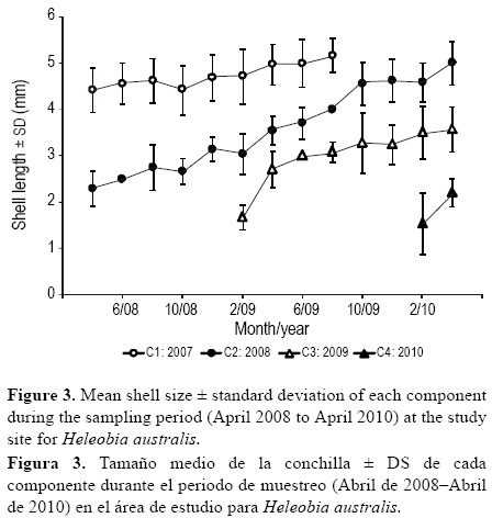 Las distribuciones de frecuencia de tallas de H. australis se ajustaron a una distribución polimodal (fig. 2). Cuatro clases de edad fueron identificadas a lo largo de dos años de estudio: cohortes I (2007), II (2008), III (2009) y IV (2010) (fig. 3). Las cohortes II y III fueron seguidas desde su reclutamiento hasta el final del periodo de estudio (24 y 14 meses, respectivamente), y alcanzaron una talla promedio de 5.01 ± 0.48 y 3.57 ± 0.49 mm, respectivamente. A su vez, en 2010, fue posible identificar el reclutamiento de la cohorte IV.