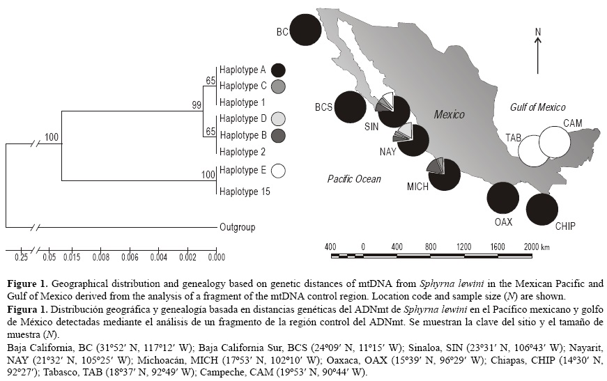Se analizaron 714 pb de la región control del ADNmt y se identificaron cinco haplotipos (tabla 1) en 149 de los 176 individuos recolectados, y se estimó la diversidad haplotípica total en h = 0.493 y la diversidad nucleotídica en π = 0.011. Los valores más altos de diversidad haplotípica se observaron en las localidades de la región central (SIN, NAY y MICH), mientras que el resto de las localidades analizadas no mostraron variación (tabla 1). El haplotipo E fue dominante en el golfo de México, pero también fue detectado con bajas frecuencias en el Pacífico, en SIN.