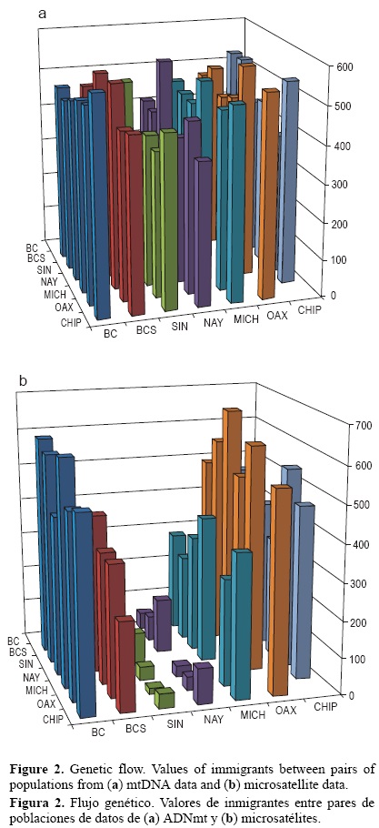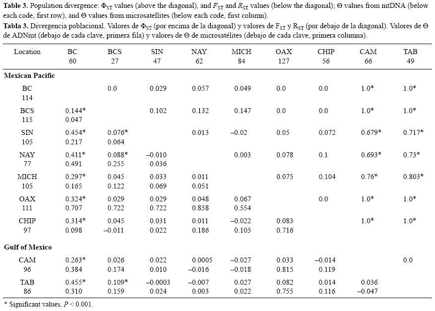 Las poblaciones que mostraron desviación de H-W en algunos loci también mostraron valores de probabilidad significativa en los índices de fijación FIS de los mismos loci, lo que implica un importante efecto endogámico y explica las desviaciones de H-W observadas. Sin embargo, los valores de probabilidad de FIS derivados de los loci en todas las poblaciones resultaron significativos únicamente para las muestras de BC y BCS en el Pacífico mexicano y para las dos localidades del golfo de México. Estos resultados sugieren un marcado patrón de endogamia para estas cuatro poblaciones, aunque los resultados obtenidos para las localidades del golfo de México pueden deberse a efectos de una muestra reducida de esta región.