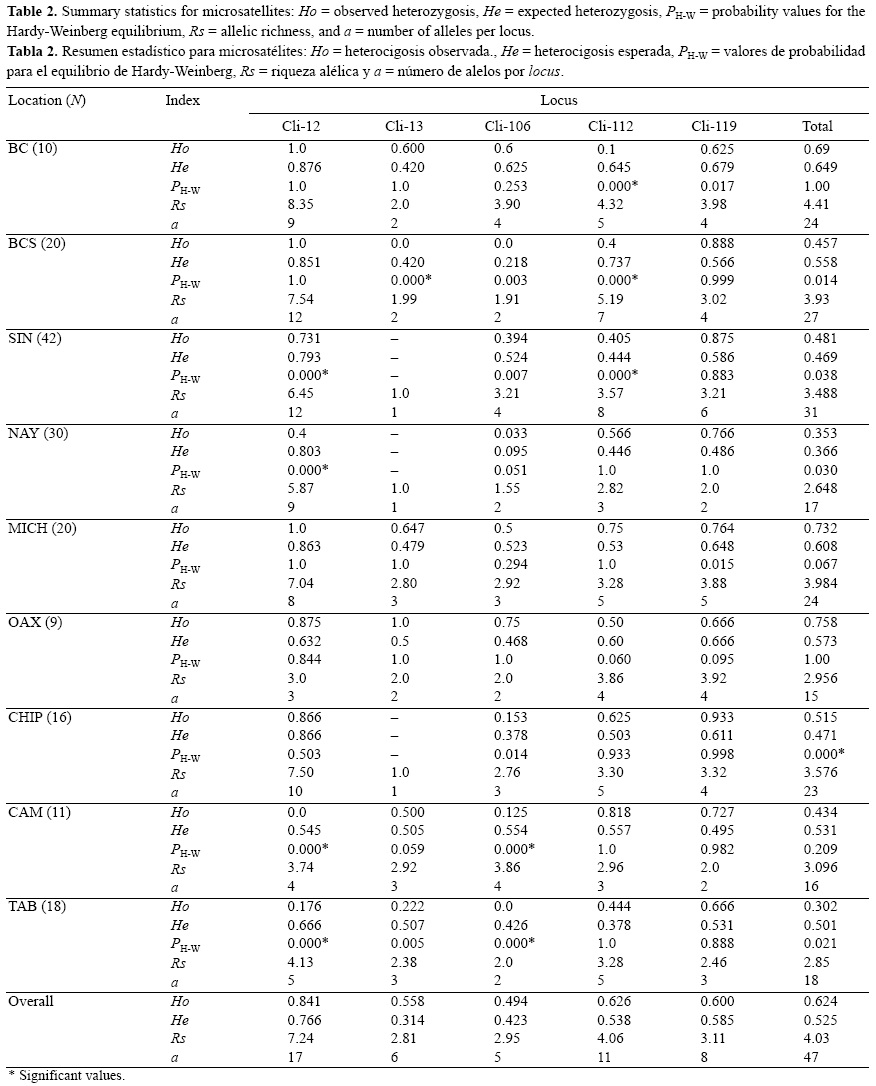 El locus Cli-13 de microsatélites fue monomórfico para las muestras de SIN, NAY y CHIP. El valor promedio de heterocigosis total esperada fue de He = 0.525; la mayor riqueza alélica y heterocigosidad se presentaron en NAY, mientras que BC mostró los valores más bajos. Las frecuencias genotípicas con ajuste al equilibrio de H-W se presentaron en 32 de las 42 pruebas para el análisis de localidades, mientras que las nueve pruebas restantes podrían contener algunos alelos nulos en los loci analizados (tabla 2). Únicamente la muestra de BCS mostró evidencia de desequilibrio de ligamiento en dos loci, Cli-13 y Cli-112. Los valores de FIS fueron significativos en los mismo loci que no mostraron equilibrio de H-W.