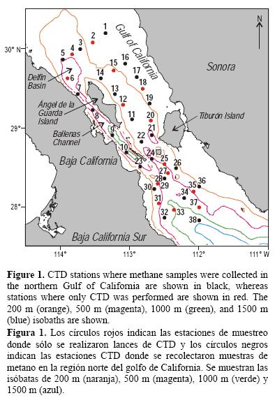Regiones oceanográficas de alta productividad o de surgencias frecuentemente actúan como fuentes de metano a la atmósfera (Kock et al. 2008). Se ha demostrado que la región norte del GC (fig. 1) presenta alta productividad primaria (Zeitzschel 1969, Álvarez-Borrego y Lara-Lara 1991) en respuesta a un mayor desplazamiento ascendente de agua rica en nutrientes. Este aumento de la productividad resulta en un alto flujo descendente de materia orgánica particulada, cuya descomposición puede contribuir a la producción de metano en el sedimento. La región norte del GC comienza justo al sur de las grandes islas (Tiburón, San Lorenzo y San Esteban) y se extiende hacia el norte (fig. 1). El intercambio de agua entre las regiones norte y sur del GC está limitado por la presencia de umbrales de profundidad variable, de los cuales San Lorenzo (400 m de profundidad) y San Esteban (600 m de profundidad) son los más importantes (Padilla et al. 2006).